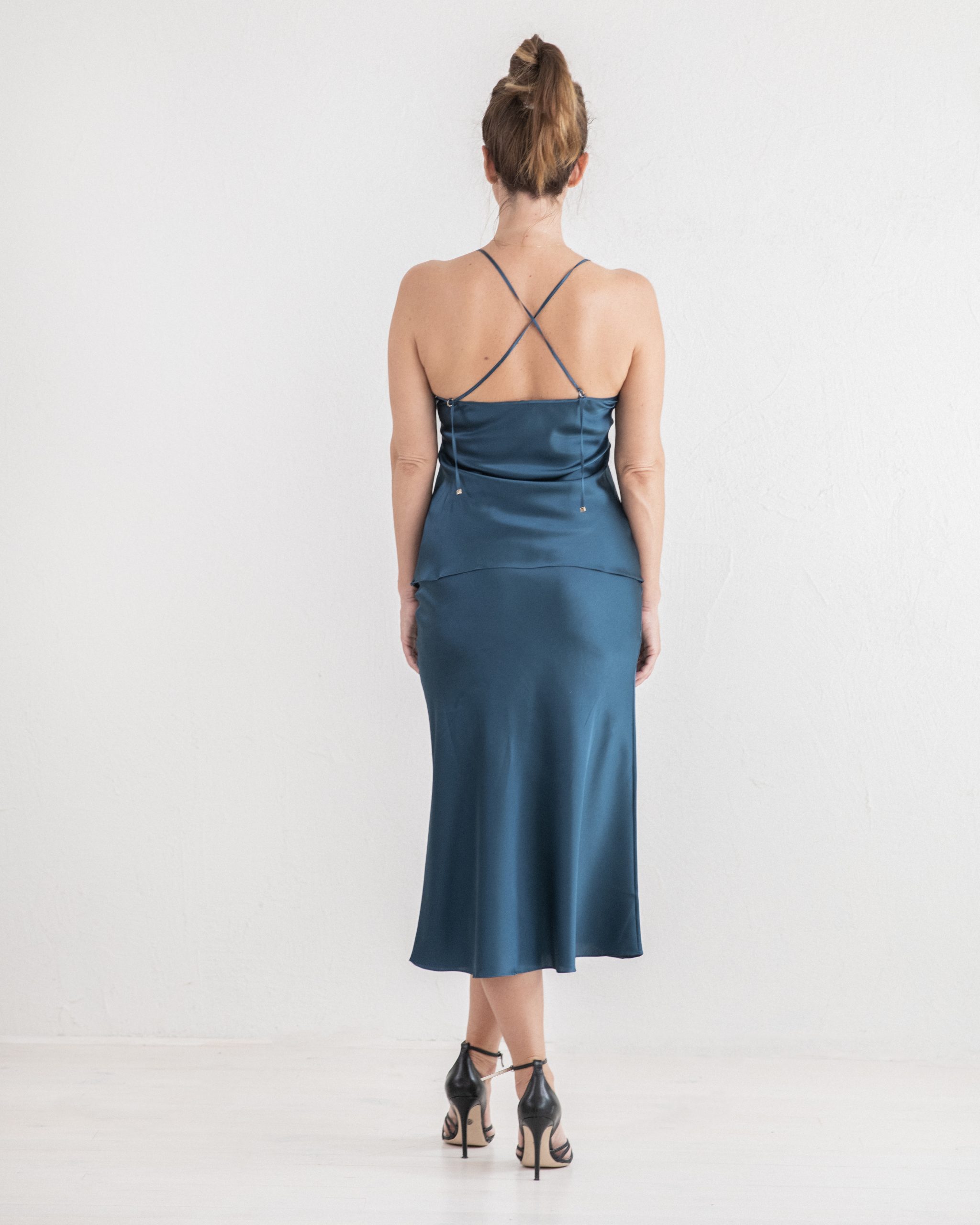 The long, delicate straps can be tied in multiple ways – around the neck, over the shoulders, crossed at the front or back, or left to fall freely down the back. The options are endless, allowing the blouse to shift with your mood and style. Subtle metal tips at the ends of the straps add an elegant,luxurious finish.